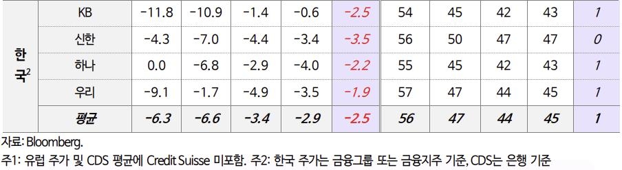 영국 HSBC는 49bp에서 60bp로, 프랑스 BNP파리바는 53bp에서 77bp로, 스페인 산탄데르는 57bp에서 85bp로 상승하는 등 국가를 가리지 않고 유럽지역의 은행 부도 위험이 급등한 것으로 나타났다.