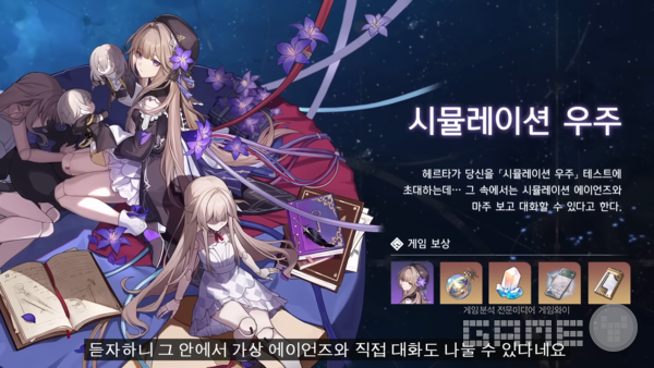 또 다른 콘텐츠인 시뮬레이션 우주는 개척의 에이언즈 아키비리를 연기해 다른 고대 에이언즈의 비밀을 캐내는 콘텐츠다. 이용자들은 하나의 축복을 선택해 캐릭터와 파티를 강화시키며 전투를 이어 나가게 된다. 로그라이크와 비슷한 느낌을 가지고 있고, 최초 클리어 시 4성 캐릭터 헤르타를 보상으로 받을 수 있다.