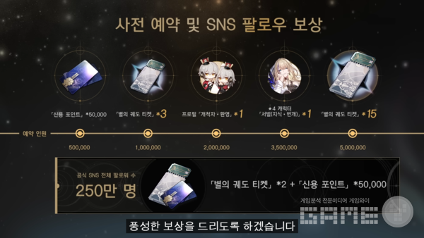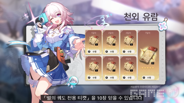 ‘붕괴: 스타레일’의 1.0 버전에서 이용자들은 일주일 동안 로그인하면 별의 궤도 전용 티켓 10장을 얻을 수 있다. 뿐만 아니라 사전 예약 및 SNS 팔로우 보상을 달성하게 되면 4성 캐릭터 서벌과 총 별의 궤도 티켓 20장 등 게임 내 추가 아이템을 받을 수 있다.