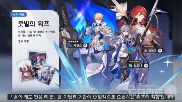 캐릭터 뽑기는 워프라 불리는데, 가챠권인 별의 궤도 티켓을 사용해 뭇별의 워프와 초행길 워프에 사용할 수 있다. 별의 궤도 전용 티켓은 특정 캐릭터와 광추를 얻을 수 있는 이벤트 워프에 사용하게 된다. 1.0 버전의 전반부에서는 제레와 관련 광추인 세월의 응고를, 후반부에는 경원과 관련 광추인 세월의 응고가 진행될 예정이다.