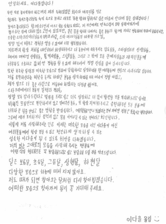 5일 이다을은 "이렇게 소중한 경험을 하게 해주신 전세계 모든 분들께 감사드린다"며 자필 편지를 남겼다.