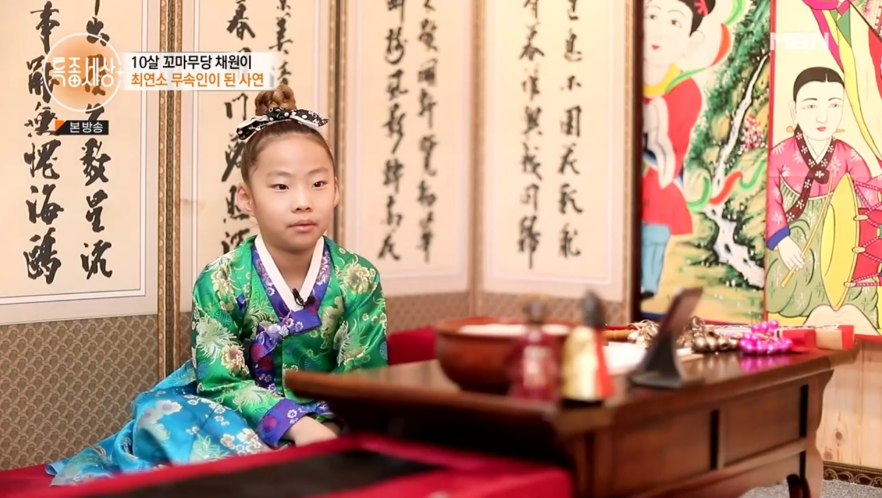 "작년 9살에 되던 해에 무속인이 됐다"는 채원이. 엄마는 "신 받기 전까지 눈물로 살았다. 신 받고 나서 아이가 좋아하고 행복해하는 모습을 보니까 가슴 아팠던 게 언제 그랬나 싶게 씻겨 내려가더라"고 말했다.