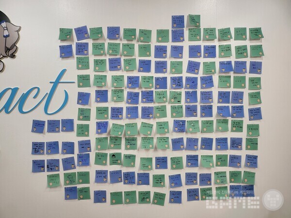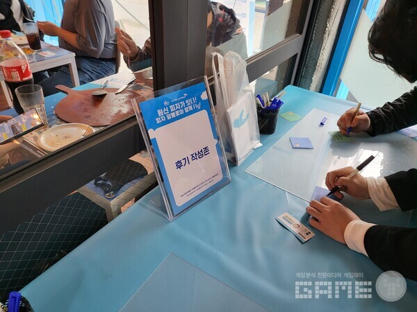 매장 안에서는 로고를 맞추는 이벤트와 하늘색 공을 잡아야되는 이른바 에어볼 이벤트 등을 체험할 수 있었다. 옆에는 포스트잇으로 방문 후기를 작성할 수 있는 이벤트도 있었는데 이른 시간임에도 불구하고 많은 이용자들이 매장을 방문한 것을 확인할 수 있었다.