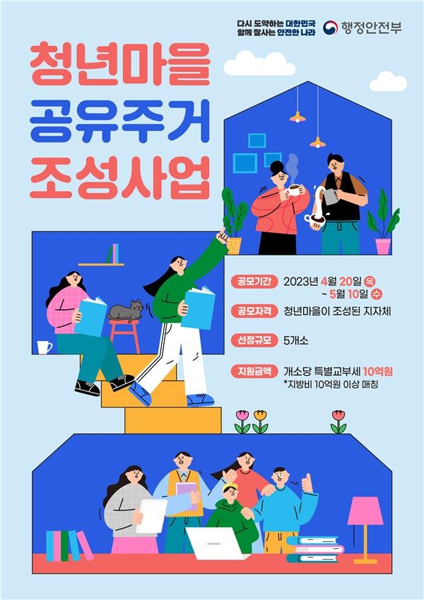 (서울=연합뉴스) 김윤구 기자 = 행정안전부는 '청년마을'이 있는 39개 지역을 대상으로 청년들의 보금자리를 조성하는 2023년 청년마을 공유주거 조성사업을 공개 모집한다고 19일 밝혔다.