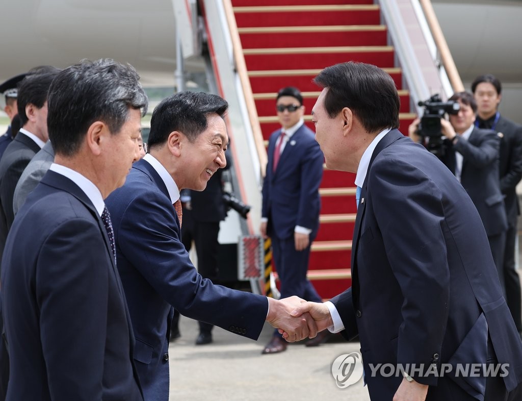 여당에서는 김기현 대표와 윤재옥 원내대표가, 정부에서는 한창섭 행정안전부 차관(장관 직무대행)과 장호진 외교부 1차관이 배웅했다.