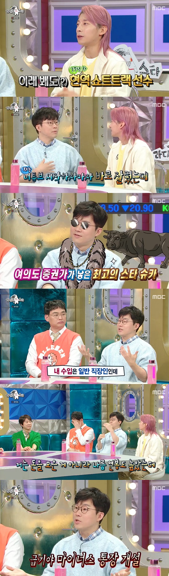 이날 '여의도 증권가' 직장인 출신 유튜버 슈카는 유튜브와 쇼트트랙 국가대표 선수 현역 활동을 함께하는 곽윤기에 깜짝 놀라며 "아직 현역이냐, 저는 유튜브 하다가 바로 잘렸다"며 겸직 불가했던 자신의 직업을 언급했다.