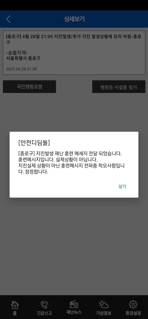 종로구는 오후 9시 47분께 재난문자 시스템으로 "지진발생 재난훈련 메세지가 전달됐다"라면서 "실제상황이 아니다"라고 밝혔다.