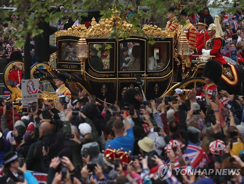 찰스 3세 부부가 웨스트민스터 사원으로 향하는 2㎞ 구간은 영국 국기인 '유니언잭'을 흔들며 '왕의 행렬'을 지켜보려는 사람들로 인산인해를 이루면서 사방이 붉은색과 푸른색으로 물들었다.