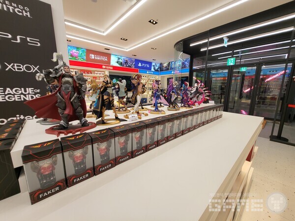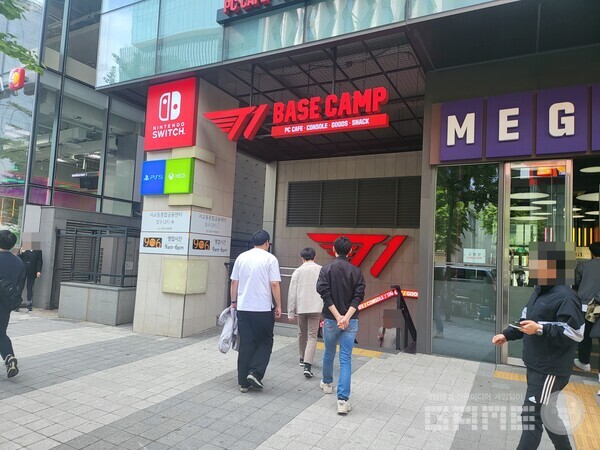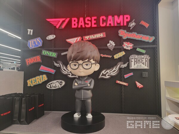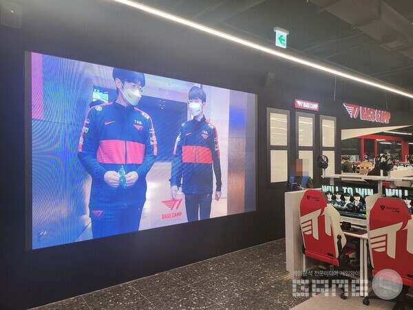 간판 아래의 계단을 타고 내려가면 T1 베이스 캠프에 입장할 수 있다. PC방에 입장하자마자 페이커 선수의 피규어가 큰 사이즈로 준비되어 있는 것을 볼 수 있었다. 뿐만 아니라 좌측에 위치한 대형 스크린에는 T1 선수들이 나오는 영상이 재생되고 있었다.