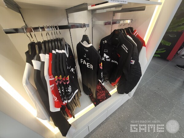 T1 베이스 캠프인 만큼, T1 팬들만을 위한 공간도 존재했다. 선수들이 입고 있는 유니폼을 시작으로 관련 굿즈들을 구매할 수 있는 MD샵이 준비되어 있었다. T1 굿즈뿐만 아니라 ‘리그 오브 레전드’의 다양한 공식 굿즈와 좌석에서 사용한 마우스, 키보드, 헤드셋도 현장에서 구매할 수 있다.