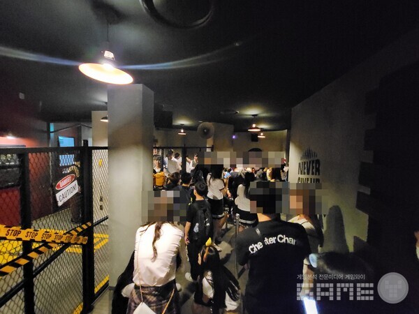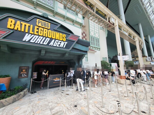 ‘배틀그라운드’의 어트랙션인 ‘ 배틀그라운드 월드 에이전트’는 올라간 입구에서 바로 정면에 위치해 있었다. ‘배틀그라운드’의 보급상자와 족자봉이 가는 길에 있어 쉽게 찾을 수 있었다. 대기열이 두 줄밖에 없었기에 “금방 들어가겠구나” 생각했는데, 아니나 다를까 내부 줄이 외부까지 이어졌던 것으로 약 1시간 정도 대기해야 입장할 수 있다는 안내를 받았다.
