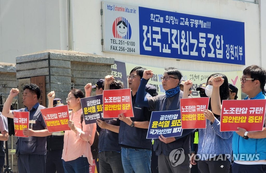 (춘천=연합뉴스) 양지웅 서혜림 강태현 기자 = 전국교직원노동조합(전교조)이 23일 국가정보원의 강원지부 사무실 등 압수수색에 대해 공안 탄압이라고 주장하며 속칭 '노조 죽이기' 중단을 촉구하고 나섰다.