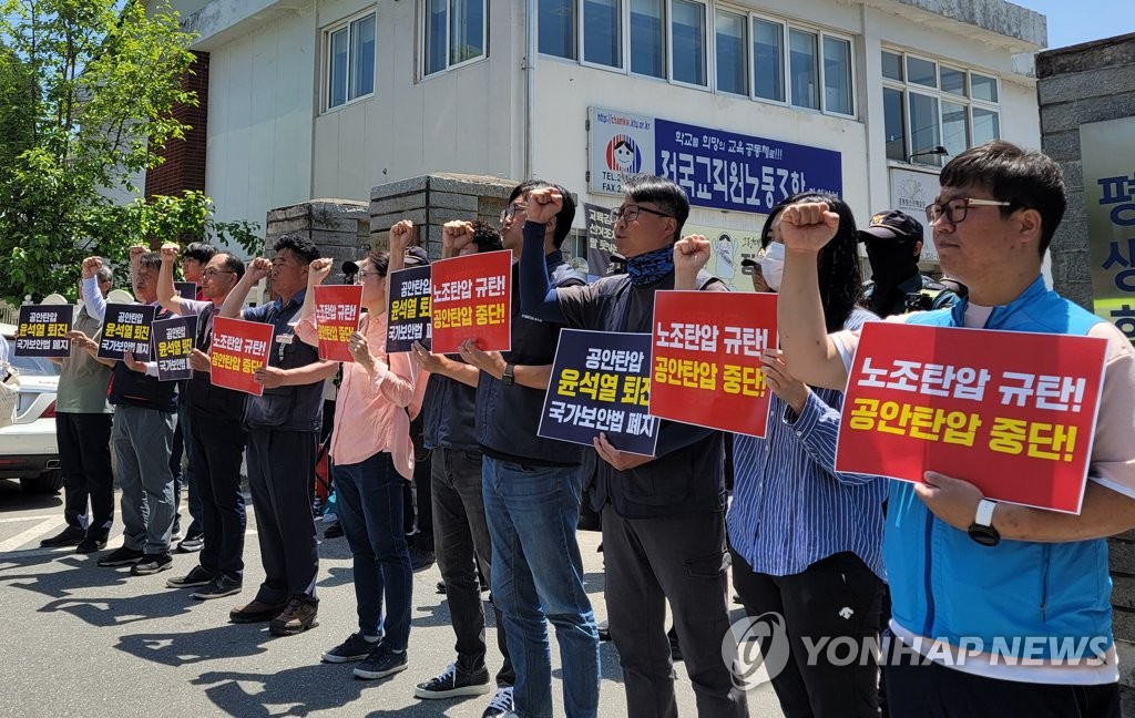 이어 "한 명의 선생님에 대한 압수수색이지만 이를 통해 전교조를 탄압할 것이 명약관화하다"며 "전교조는 시국선언과 정부 퇴진 구호를 외치며 윤석열 대통령이 퇴진할 때까지 싸우겠다"고 덧붙였다.