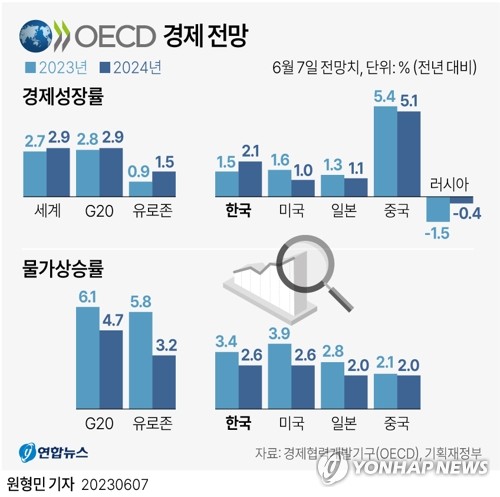 OECD는 2023년 한국 성장률을 2021년 12월에 2.7%로 제시한 이후 작년 6월 2.5%, 9월 2.2%, 11월 1.8%, 올해 3월 1.6% 등으로 계속 하향 조정해왔다.