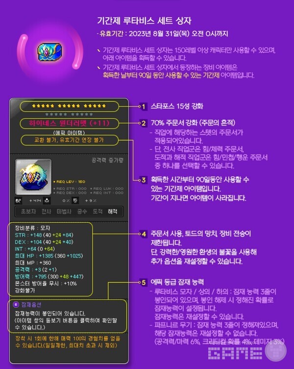 150레벨을 달성하면 기간제 루타비스 세트 장비를 얻을 수 있다. 루타비스 장비는 200레벨이상까지도 사용할 만한데, 기본적으로 스타포스 15성이기에 스타포스 수치에 신경을 덜 써도 되는 장점이 있다. 그리고 수상한 큐브를 사용해 주 옵션을 맞춰 더 오래 사용해도 된다.