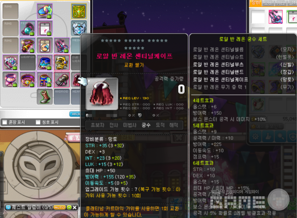 일일 보스를 잡으면서 성장했다면 아래와 비슷한 세팅이 될 것이며, 이 장비들을 150레벨까지 무난히 사용할 수 있다. 130레벨에 가성비가 좋은 로얄 발레온 세트가 있는데, 이 아이템을 세팅에 섞어서 사용하는 것도 나쁘지 않은 성능을 보여준다.