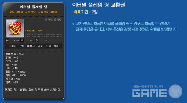 210레벨에는 이터널 플레임 링을 획득할 수 있는데 기본적으로 유니크 등급을 가지고 있다. 이 아이템의 정말 260레벨까지도 무난히 사용할 수 있으며, 게임 내 이벤트를 통해 획득 가능한 이벤트링 전용 명장 큐브를 통해 자신 스탯에 맞는 옵션을 만들면서 사용하면 된다.