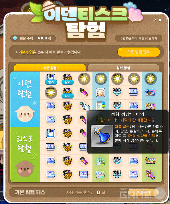 성장하다 보면 여러 일일 보스들이 열리게 되는데, 하이퍼 버닝 보상으로 얻을 수 있는 성향 성장의 비약을 사용해 매력을 30까지 올리면 잠겨있던 포켓 슬롯이 열린다. 이곳에 핑크빈 성배와 같은 장비를 착용하면 된다. 또한 좌측 퀘스트를 주는 전구에서 엠블렘을 주는 퀘스트도 볼 수 있는데, 바로 클리어한 후 착용하면 된다.