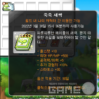 ‘쑥쑥 새싹’ 칭호에 기타 다른 옵션도 있지만 경험치 10% 옵션과 스타포스 +30이 높은 성능을 보여주기 때문이다. ‘쑥쑥 새싹’ 칭호의 경우는 월드별 한 번 사용할 수 있기에, 자신의 메인 캐릭터에 사용하는 것을 추천한다. 성능도 좋기에 사실상 필수라고도 볼 수 있다.