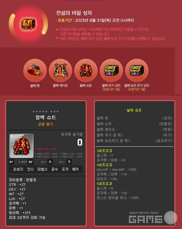 100레벨을 달성하면 블랙 세트를 얻을 수 있는 전설의 비밀상자를 받을 수 있다. 이 장비를 150레벨까지 무난하게 사용할 수 있는데, 100레벨까지 모은 메소로 주문서 작업과 스타포스 작업을 간단하게 블랙 세트에 해야한다.