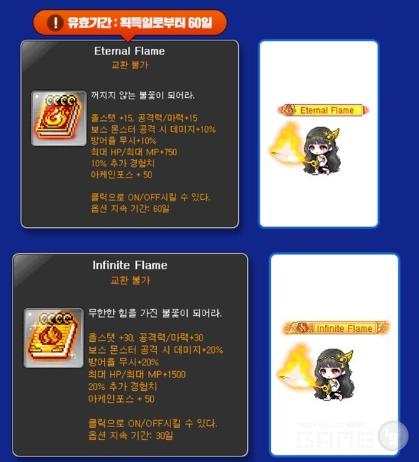 250레벨에는 인피니트 플레임 칭호를 얻을 수 있다. 기간이 지나면 옵션이 사라지는 단점이 있지만, 이터널 플레임 칭호의 강화버전이기에 획득하면 바로 교체해서 사용하면 된다.