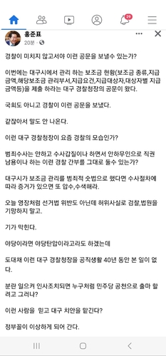 홍 시장은 "이번에는 시에서 관리하는 보조금 현황(보조금 종류, 지급 금액, 해당보조금 관리 부서, 지급요건, 지급대상자, 대상자별 지급금액 등)을 제출하라는 대구경찰청장의 공문이 왔다"고 공개했다.