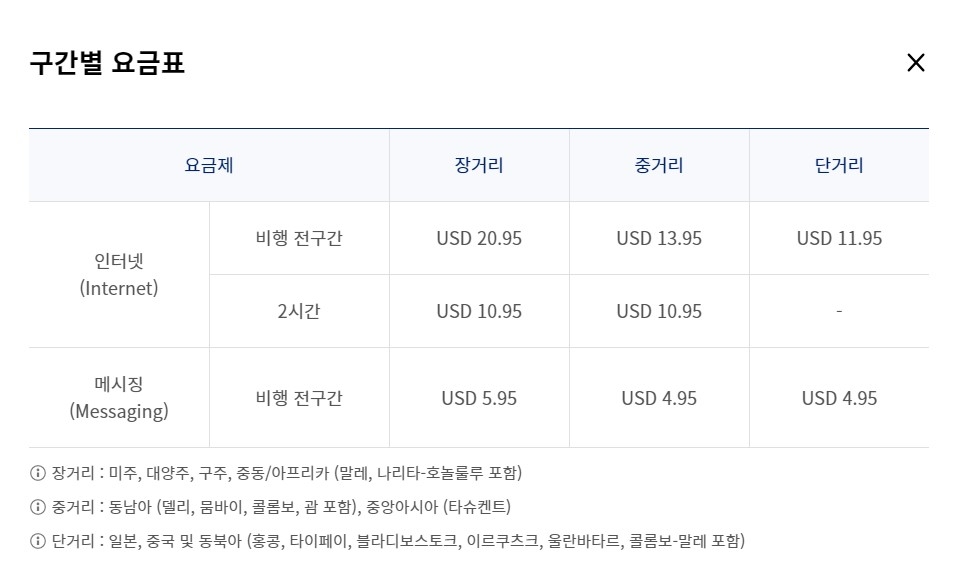 요금은 거리별로 장거리(미주, 대양주, 유럽, 중동, 아프리카), 중거리(동남아, 중앙아시아), 단거리(일본, 중국, 동북아)로 구분된다.