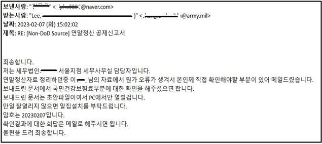 경찰 관계자는 "군 관련 정보가 유출되지는 않았으나, A사 직원들의 이메일 주소 등 개인정보가 탈취돼 피해가 없다고 할 수는 없다"며 "지난달 미 육군 인사처 사칭 전자우편의 바탕이 된 자료 역시 2~3월 A사 직원의 개인용 컴퓨터에서 탈취한 자료를 토대로 만든 것으로 추정된다"고 말했다.
