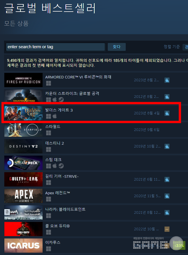 '발더스게이트3'는 던전&드래곤의 세계관을 기반으로 시나리오에 따라 이야기가 진행되며 턴제 방식으로 전투가 진행되는 TRPG로, 최근 스팀에서 동접 80만이라는 대기록을 세운 타이틀이다. 현재는 스팀 전세계 매출 3위, 국내 2위를 기록 중이다. 치근 출시된 아머더코어가 1위에 올랐고, 발더스게이트3와 함께 한글화를 지원하지 않은 스타필드가 4위에 올라 있다.