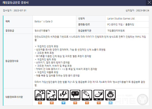 '발더스게이트3'는 라리안스튜디오(Larian Studios Games)를 통해 7월 31일 게임물관리위원회에 심의가접수됐고, 거의 한달 만에 18세 이용자 결정이났다.