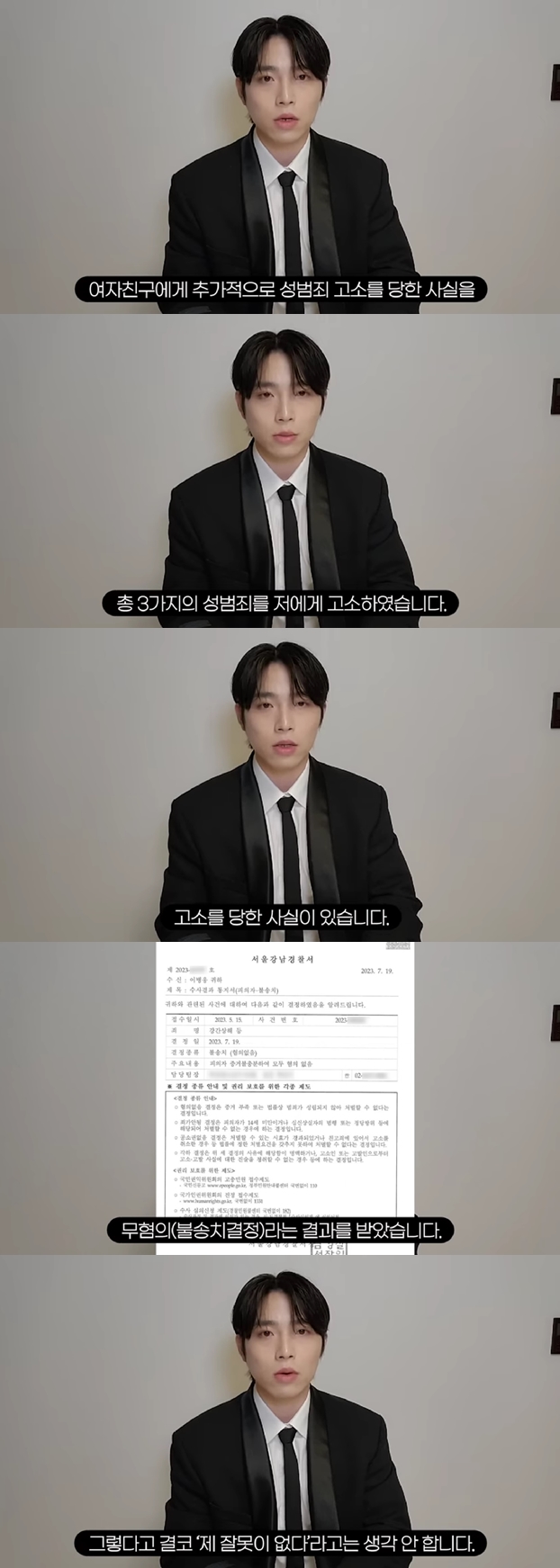 그는 "저는 강남 경찰서에 가서 성실히 임하여 조사를 받았다. 핸드폰을 제출하라고 해서 한 달 가까이 휴대폰을 제출했다. 이 3건의 모든 조사 끝에 무혐의(불송치결정)라는 결과를 받았다"고 진행상황에 대해 전했다.
