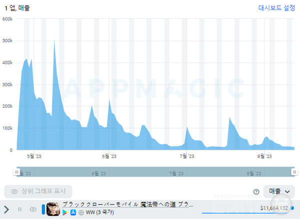 앱 매직 데이터에 따르면 '블랙 클로버 모바일'은 지난 5월 출시 이후 하루 40만 달러의 예상 매출을 보였다가 현재는 1만 3873달러로 하향 안정화된 상황이다. 누적 예상 매출은 1166만 달러(약 155억 원)이고, 다운로드는 약 150만이다. 매출 그래프가 출시 대비 크게 하향 안정화된 만큼 게임 하나밖에 없는 빅게임스튜디오로서는 차기작 출시 준비에 들어가는 것이 당연한 상황.