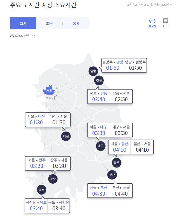 한국도로공사에 따르면 이날 오후 10시 기준 각 지역 요금소에서 서울 요금소까지 걸리는 예상 시간은 부산에서 4시간40분, 울산 4시간10분, 대구 3시간30분, 강릉 2시간50분, 대전 1시간30분 등이다.