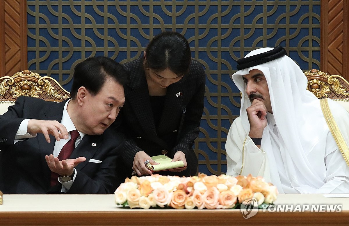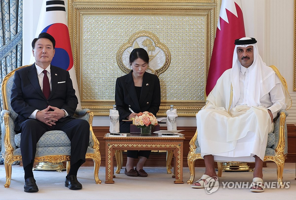 (도하=연합뉴스) 안용수 이동환 기자 = 카타르를 국빈 방문 중인 윤석열 대통령은 25일(현지시간) 타밈 빈 하마드 알사니 카타르 국왕과 정상회담을 했다.