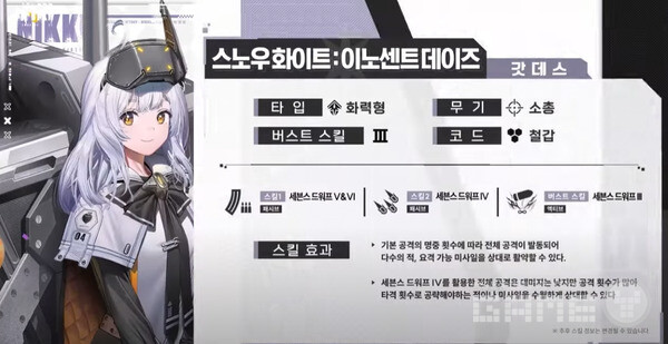 '화이트스노우'는 니케 초반 이 게임의 0티어 캐릭터로 알려졌다. 모든 능력치가 훌륭했기 때문이다. 그리고 1주년을 기념하여 다시 선보이는 이 캐릭터는 '화이트 스노우'라는 이름은 같지만 훨씬 어리고, 전혀 생긴 것이 다르다. 스노우 화이트는 일명 '백설이'로 불린다. 그렇다면 이제 백설이가 2명이 된 셈이다. 어떻게 된 일인지 천천히 살펴보자.