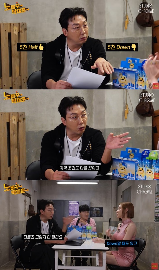 탁재훈은 "한 달에 얼마 버냐. 계약 조건 같은 것들이 다 다르기도 하겠지만, 5천 만 원으로 기준으로 UP이냐 DOWN이냐"라고 말했다.