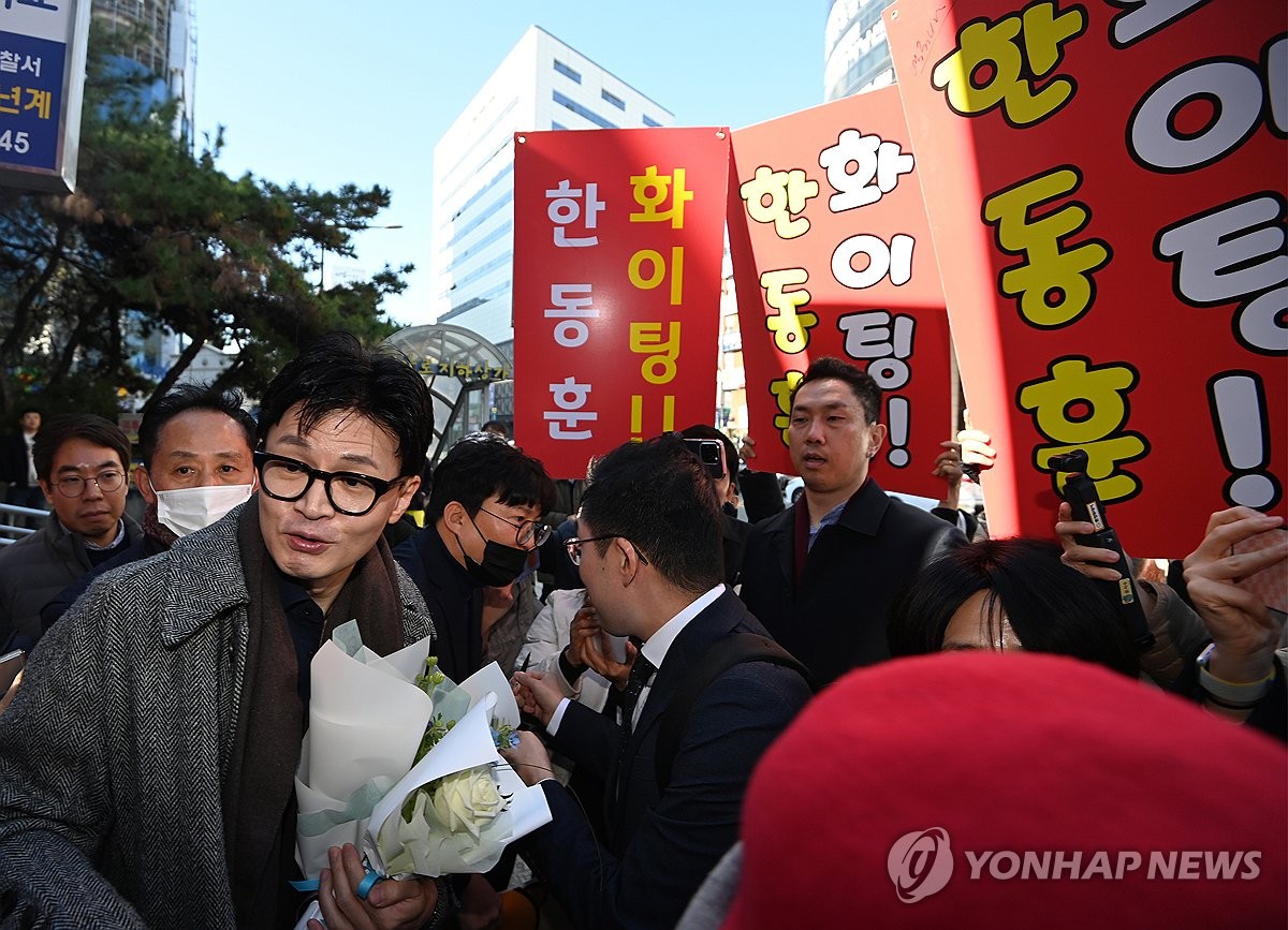 이날 한 장관이 건물 앞에 모습을 드러내자 기다리고 있던 지지자들이 꽃다발을 건네며 환호했다.