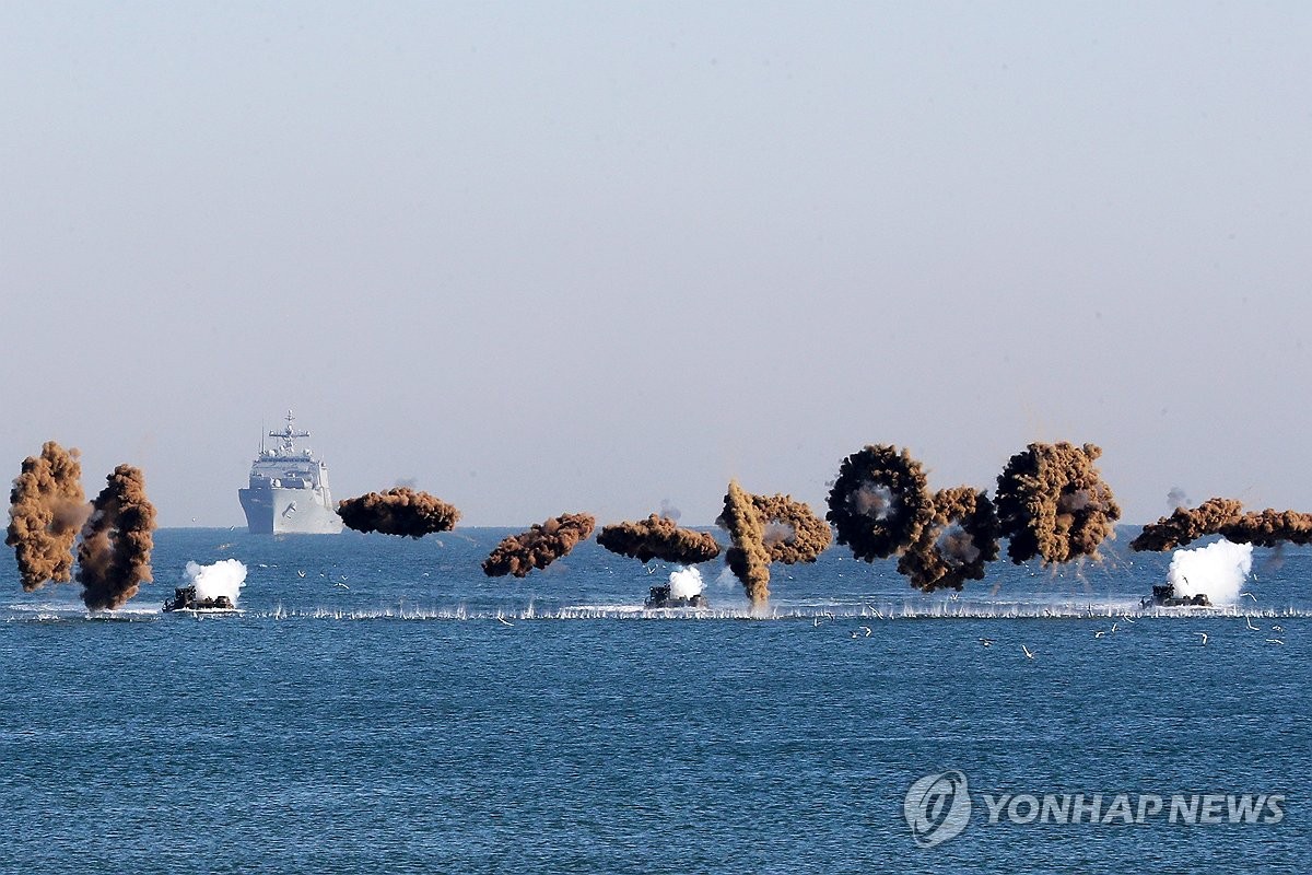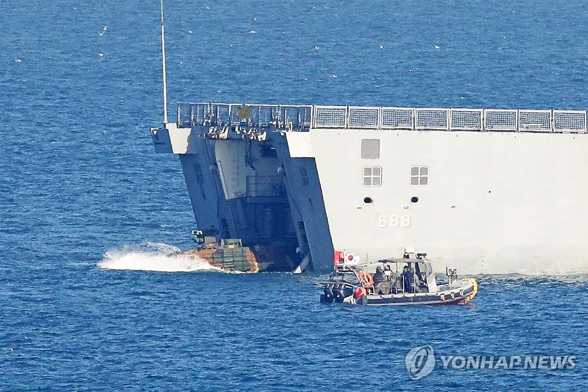 이날 오전 해가 뜬 뒤 해군 상륙함인 일출봉함과 천왕봉함에서 한국형 상륙돌격장갑차(KAAV)가 차례로 밖으로 나왔다.