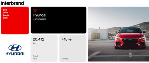 인터브랜드 관계자는 "현대차는 친환경 상품 및 혁신적 기술을 통해 브랜드의 비전을 실현하는 데 큰 진전을 이루고 있고, 지속가능성 등 인류의 핵심 가치에 대해 진정성 있는 소통으로 깊은 인상을 남기고 있다"며 "앞으로도 격변하는 모빌리티 산업에서 현대차의 성장을 기대한다"고 밝혔다.