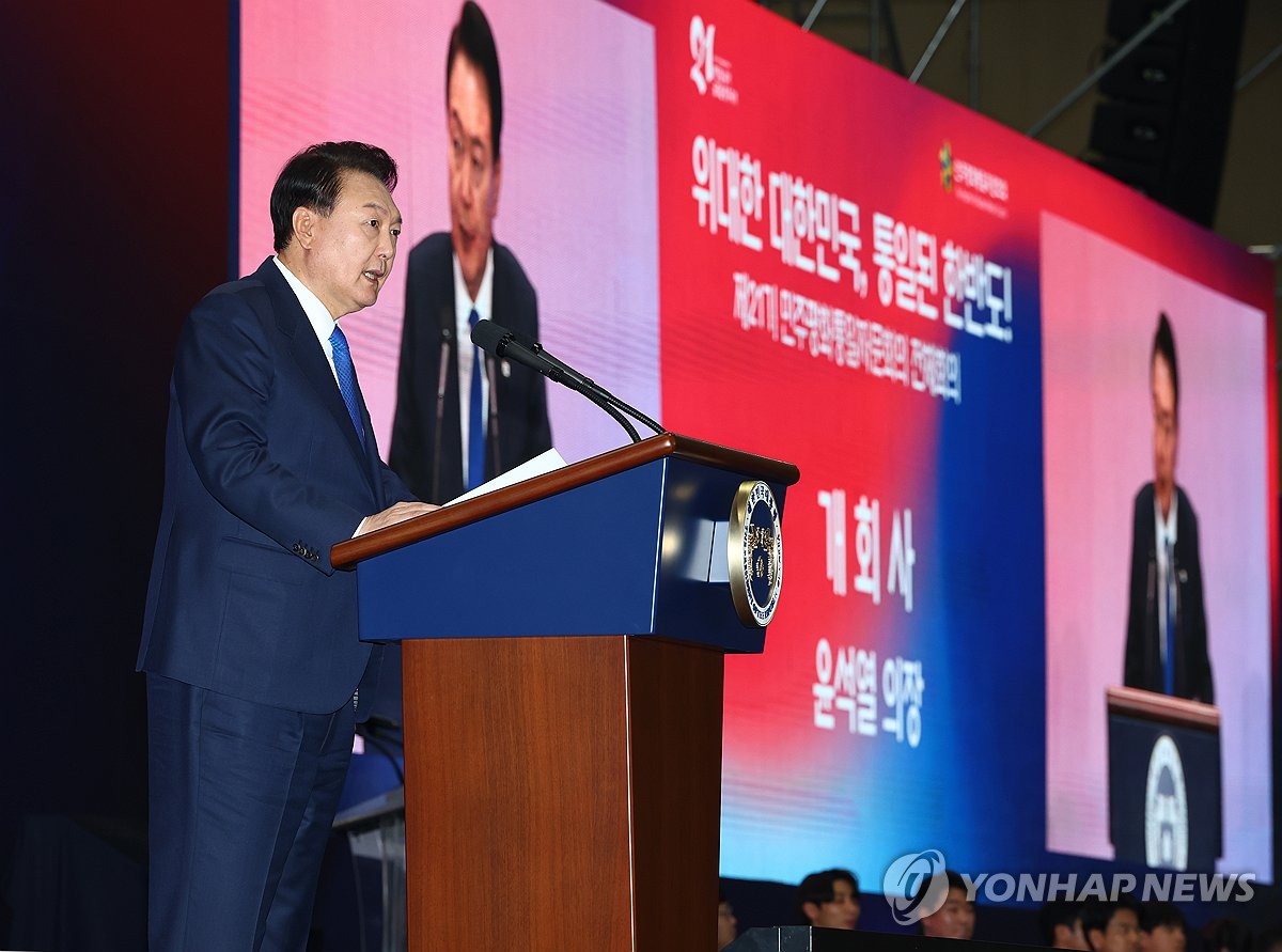 윤 대통령은 "우리가 지향하는 민주 평화통일은 남북한 모든 구성원이 자유를 누리며 함께 번영하는 통일"이라며 "자유, 인권, 법치가 살아 숨 쉬는 통일 대한민국을 이루겠다는 확고한 의지와 노력이 국제사회의 호응과 지지를 이끌어 낼 수 있을 것"이라고 말했다.