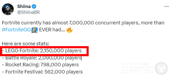 자신의 에픽게임즈의 파트너라 소개하고 있는 신나(Shiina) x 채널 운영자는 '포트나이트'가 700만이 넘는 동접 사용자를 기록했다고 게시했다. 구체적으로는 '레고 포트나이트(LEGO Fortnite)'가 215만 명, 배틀 로얄(Battle Royale)이 209만 명, '로켓 레이싱(Rocket Racing)'이 79만 명, '포트나이트 페스티벌(Fortnite Festival)'이 56만 명을 기록했다고 밝혔다.
