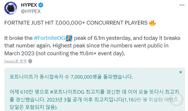 또 다른 X 이용자 하이펙스는 '포트나이트'가 어제 최고 기록인 동시 플레이어 수 610만 명을 돌파, 다시 7백만 명 이상을 돌파했다면서 이는 2023년 3월 수치가 공개된 이후 최고치라고 전했다.