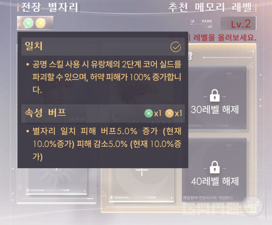 메모리 슬롯은 백야, 월광이 존재한다. 행성 자기장마다 다른 별자리를 지니고 있다. 행성 자기장의 별자리와 일치하는 메모리 선택 시 전투력이 증가한다. 보통 공명 스킬 사용 시 유광체의 2단계 코어 실드를 파괴할 수 있으며, 허약 피해가 100% 증가한다. 속성 버프도 있다. 별자리 일치 버프 피해 5.0%, 증가, 피해 감소 5.0%다.