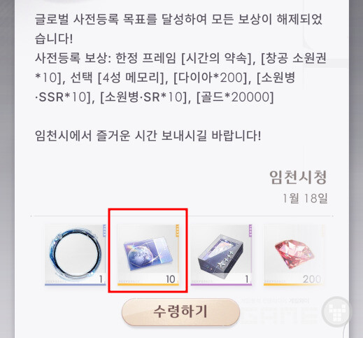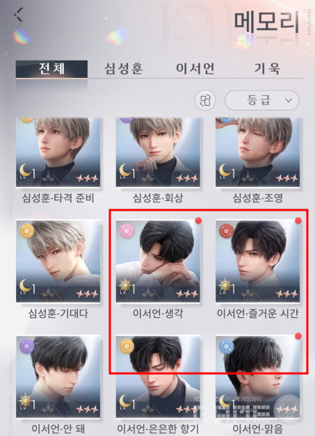 메모리 목록에서 빨간 방점이 찍힌 캐릭터 메모리는 무언가 보상을 받을 수 다는 것을 의미한다. 메모리 조각을 많이 획득해서 승급이 가능한 경우가 많다. 특히 3성 중에서 승급이 가능한 빨간 방점이 있는 캐릭터를 확인해 보자. 승급 이후 육성 보상에서 다이아 20개를 획득할 수 있다.