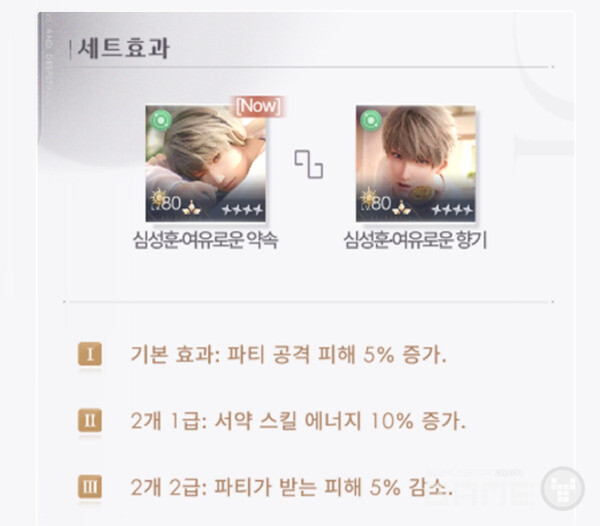 여기서 주의할 것은 파티의 세트 효과다. 파티에 2개의 동일 세트 메모리를 편성할 경우 세트 효과가 활성화된다. 메모리 세트 효과는 파트너의 작전 능력을 대폭 증가시킨다. 백야 슬롯의 메모리만 세트 효과가 전재할 수 있다. 메모리 세트의 메모리가 1,2,3급 달성시 세트 효과가 강하된다.