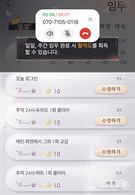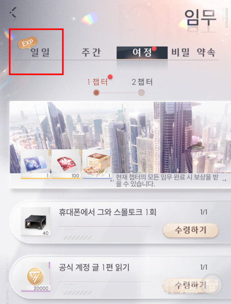 레벨을 올리는 방법은 메인화면에서 우측에 있는 일정 메뉴를 누르면 된다. 여기에는 임무가 나오는데 일일/주간/여정/비밀/약속의 탭이 존재하고 해당 임무를 수행할 때마다 주인공의 레벨업에 필요한 보상을 획득할 수 있다. 그중에서도 경험치에 필요한 보상은 일일임무에 모두 몰려 있다.