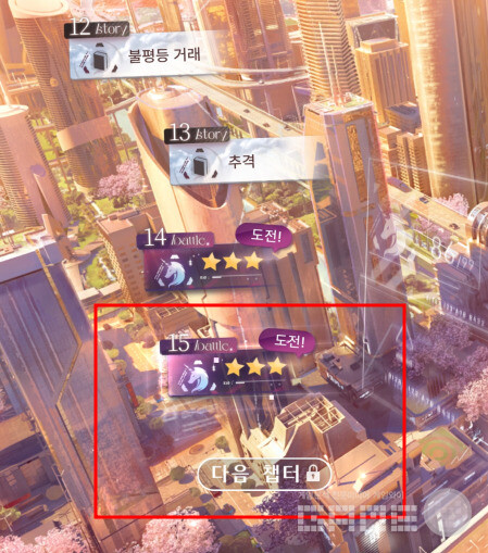 시작을 눌러 스테이지에 들어가면 2챕터까지는 막힘없이 진행이 가능하다. 하지만 3챕터 최소 진입 레벨이 21레벨이다. 이를 해결하기 위해서는 주인공의 레벨을 21레벨로 만들어야 한다.