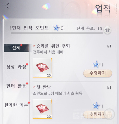 임무(일정) 메뉴와 달리 업적이라는 메뉴도 있다. 메인 화면에서 좌상측 캐릭터 메뉴를 열어 하단 가운데에서 업적 메뉴를 열 수 있다. 여기에는 현재까지 달성한 업적을 확인할 수 있으며, 파란색 업적 포인트를 획득할 수 있다.