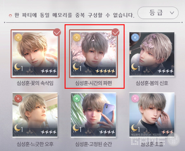 전투 전 파티를 편성할 수 있으며, 편성할 메모리를 선택할 수 있다. 여기서 방금 얻은 5성 캐릭터부터 추가를 하자.
