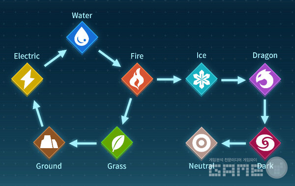 팰의 속성. 팰은 속성을 가지고 있으며 각 속성마다 유리한 속성 및 불리한 속성이 존재한다. 유리한 속성으로 공격하며 피해량이 증가하며 불리한 속성은 피해량이 감소한다.